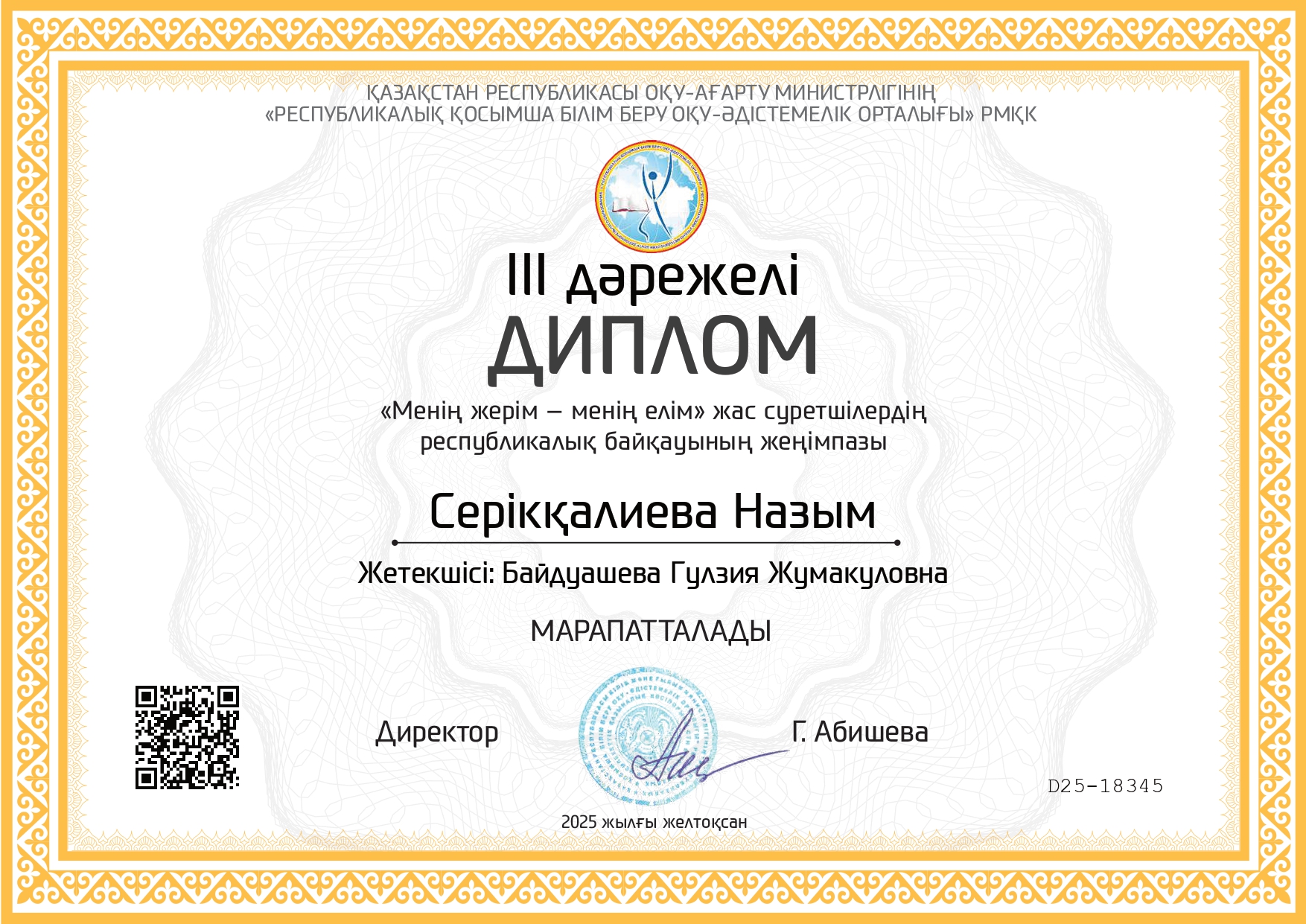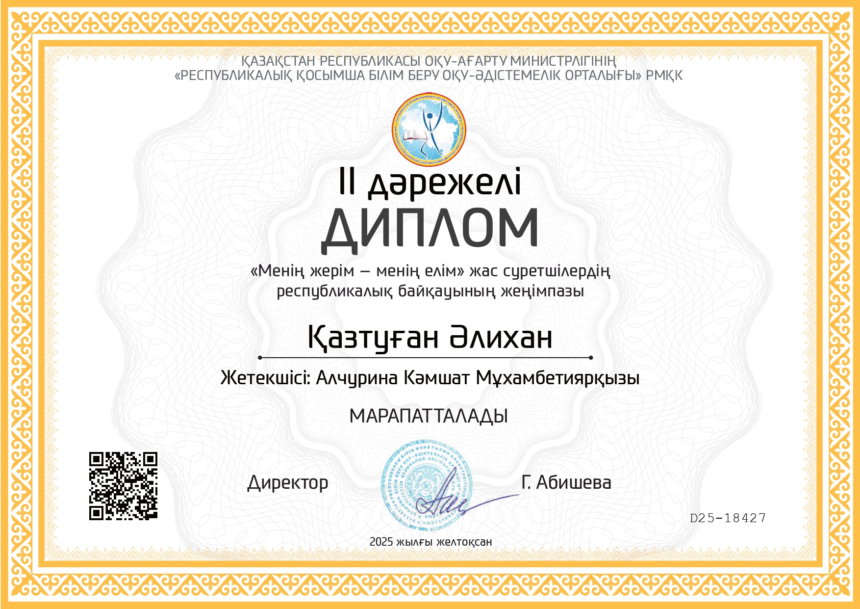 @rumcdo.kz ұйымдастырумен өткен «Менің жерім — менің елім» жас суретшілердің республикалық байқауының жеңімпаздары Қазтуған Әлихан мен Жұмабекұлы Ералы ІІ дәрежелі дипломмен, Серікқалиева Назым ІІІ дәрежелі дипломмен марапатталды