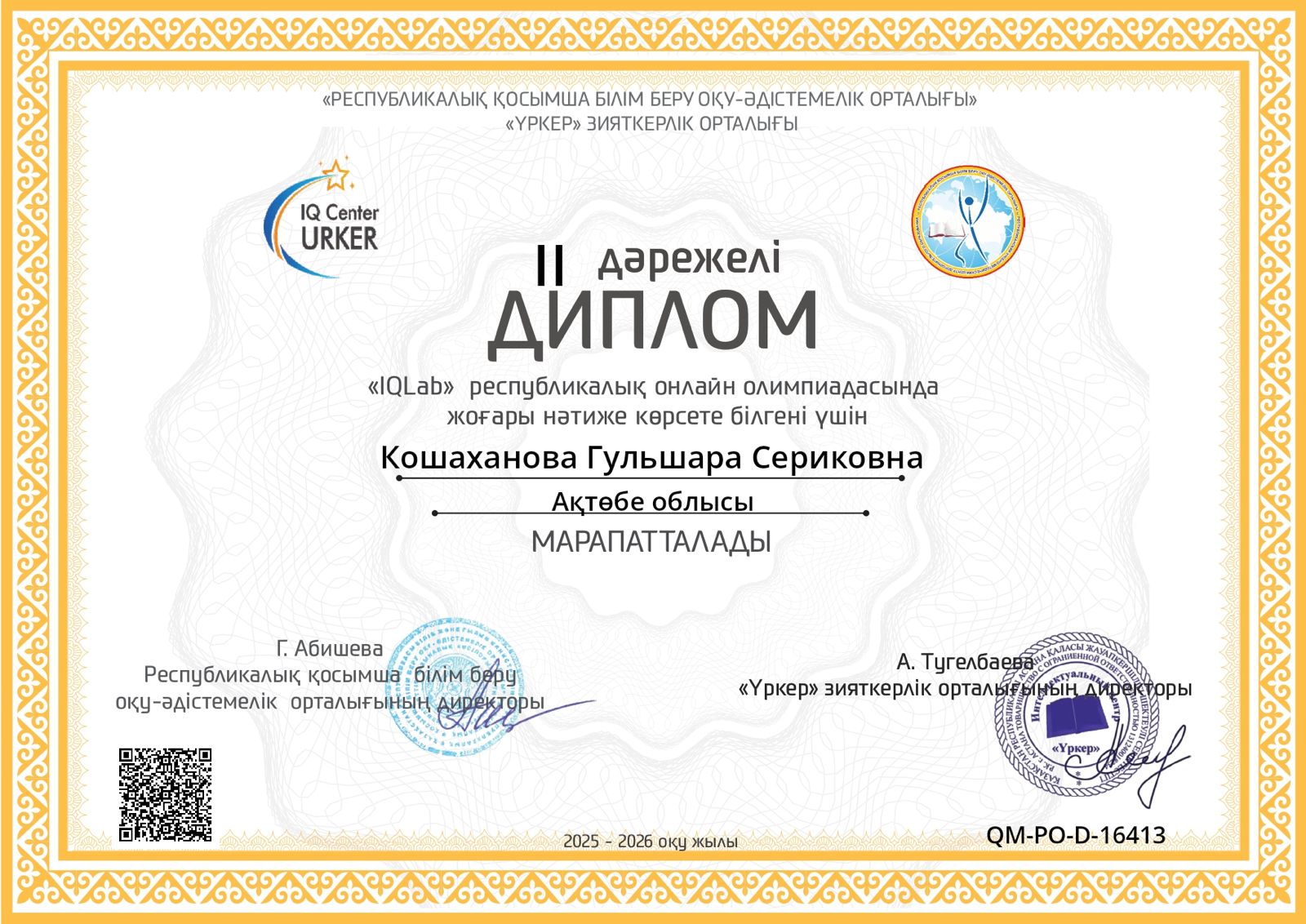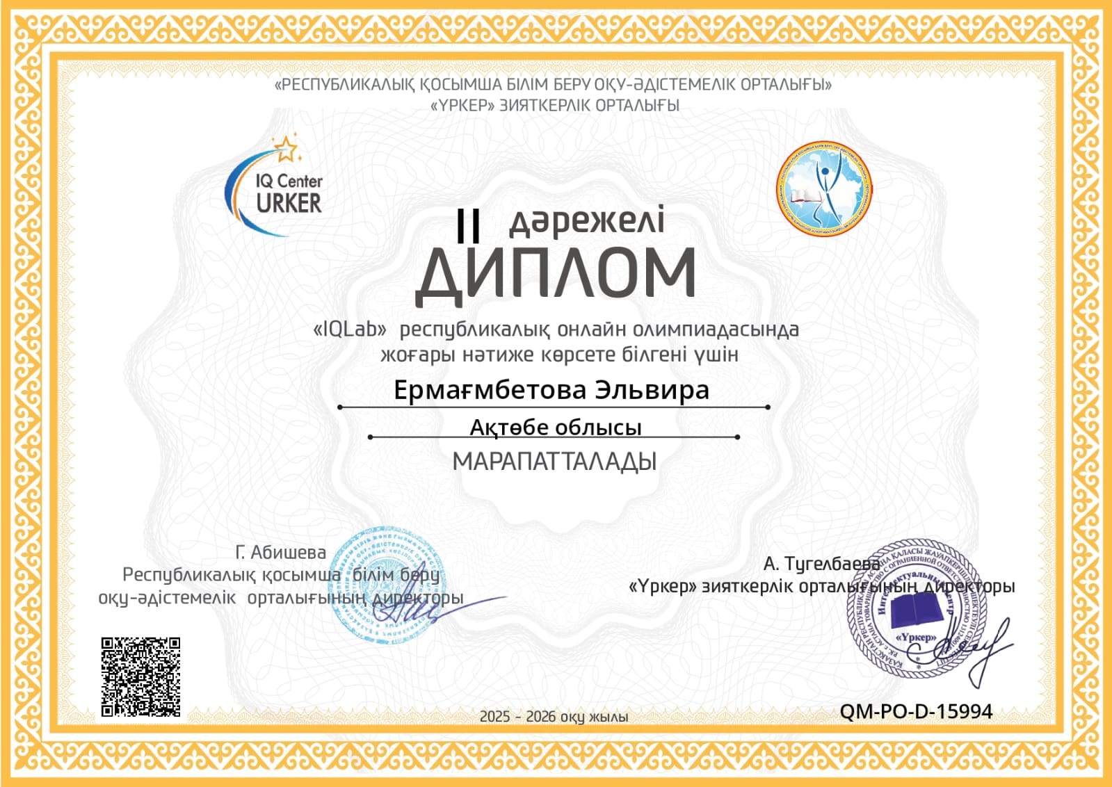 «Республикалық қосымша білім беру оқу-әдістемелік орталығы» «Үркер» зияткерлік орталығы» ұйымдастыруымен өткен «IQLab» республикалық онлайн олимпиадасына қатысып, жоғары нәтиже көрсеткені үшін