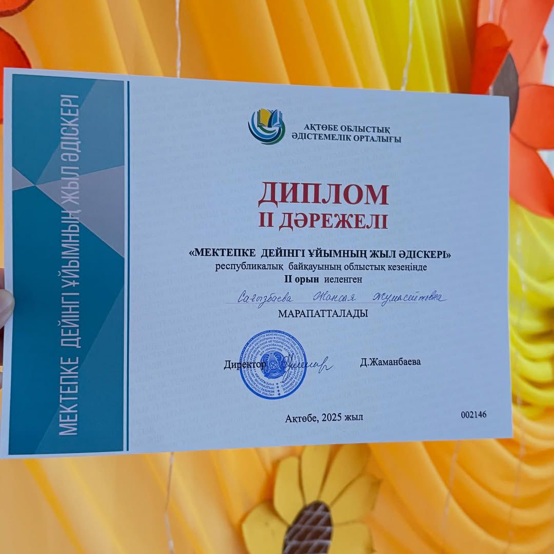 Қазақстан Республикасы Оқу-ағарту министрлігінің Балаларды ерте дамыту институтының 2025 жылғы жоспарына сәйкес Ақтөбе облыстық әдістемелік орталығының ұйымдастыруымен «Мектепке дейінгі ұйымның жыл әдіскері» республикалық байқауының облыстық кезеңіне “Балауса” бөбекжай- балабақшасының әдіскері Сагизбаева Жансая Жумасейтовна қатысып жүлделі IІ -орын иеленді.
